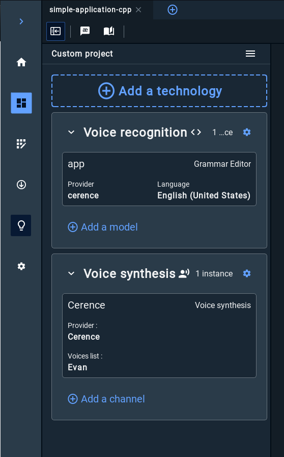 On the left side-bar, you will find cards for Voice Recognition, Voice Synthesis, or both categories depending on the sample being tested. Click on them to open the corresponding widget, edit their properties to match the engine providers you’ve used during the Conan install phase prior, and compile the grammar or save the voice list configuration.