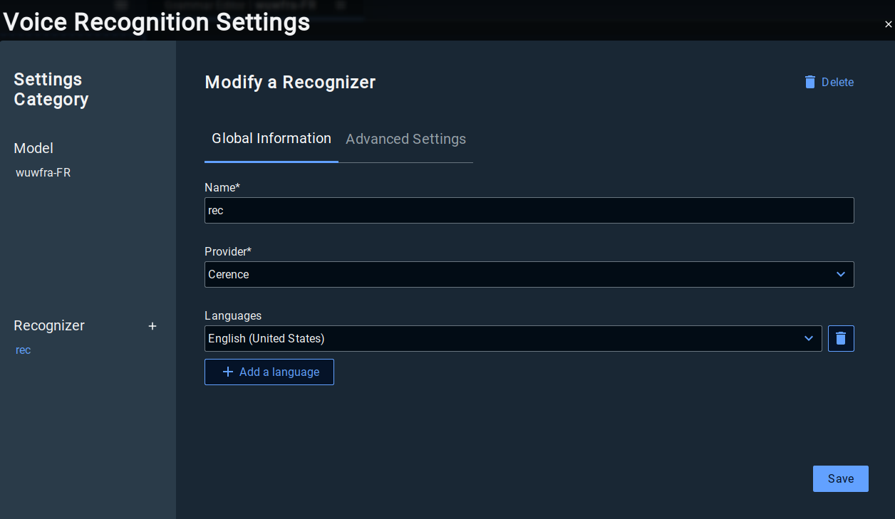 In the next page, you will be prompted to choose a provider and then a language for your recognition engine.