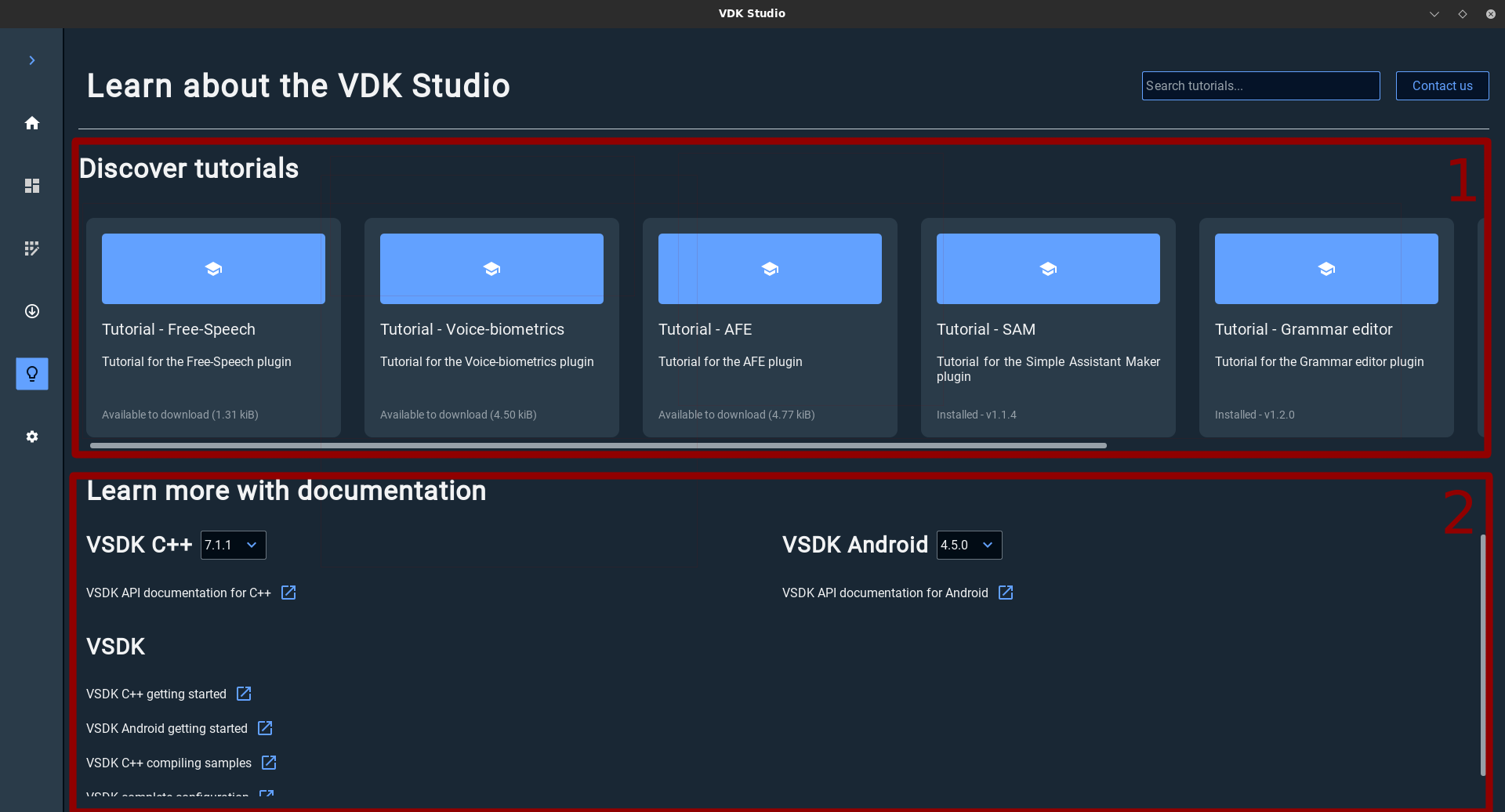Discover tutorials: Which contains a list of available quick guides on how to use a specific VDK Studio feature. You can use the search bar to search for a specific tutorial to find it quickly.