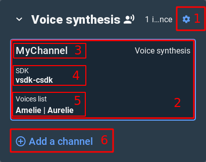 1. Voice synthesis settings. This button will open the voice synthesis settings which allows you to edit a channel SDK or delete a channel.