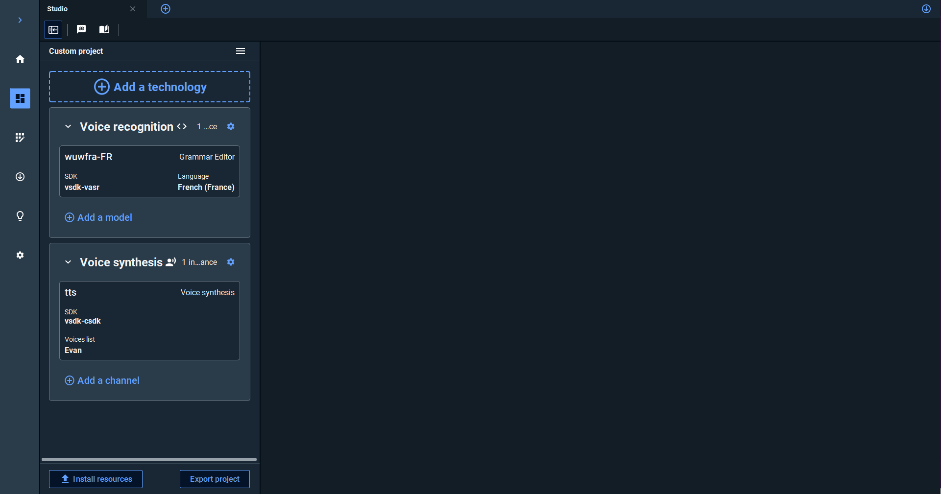 You can retrieve here your opened projects. The left panel (project-editor) displays all information about current technologies added to the project.
