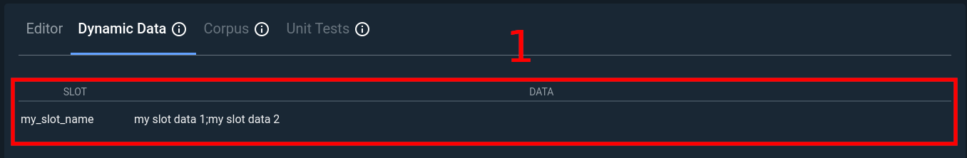 Slots data. Slots are BNF rules that are filled at runtime. Here you can provide content that will be used during testing through the previously shown test interface.