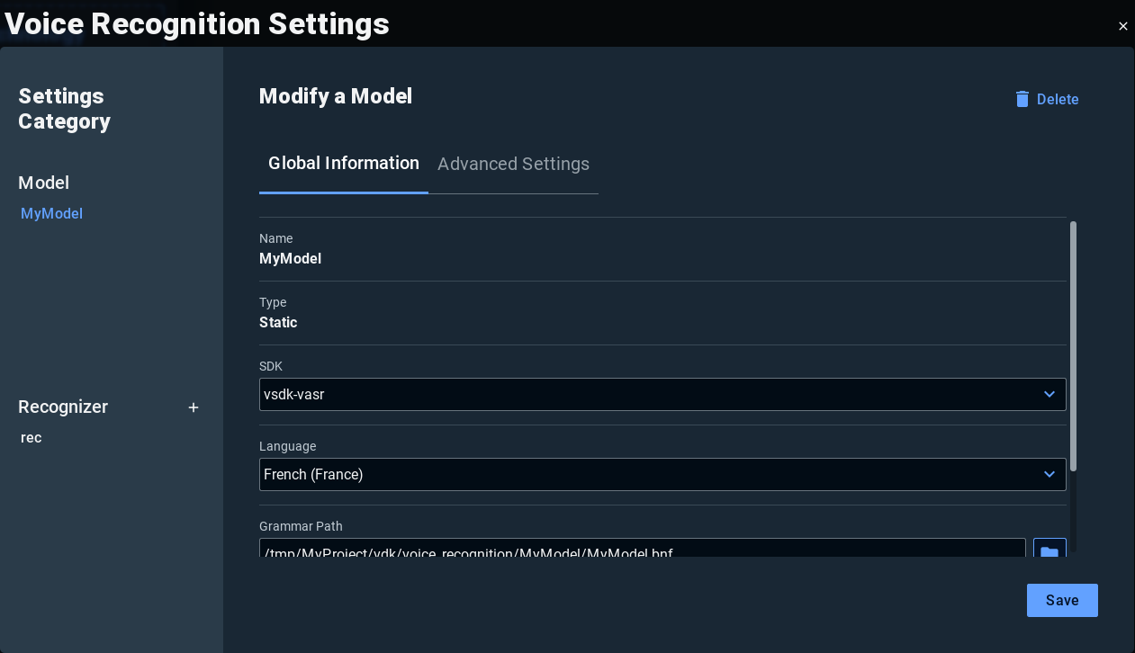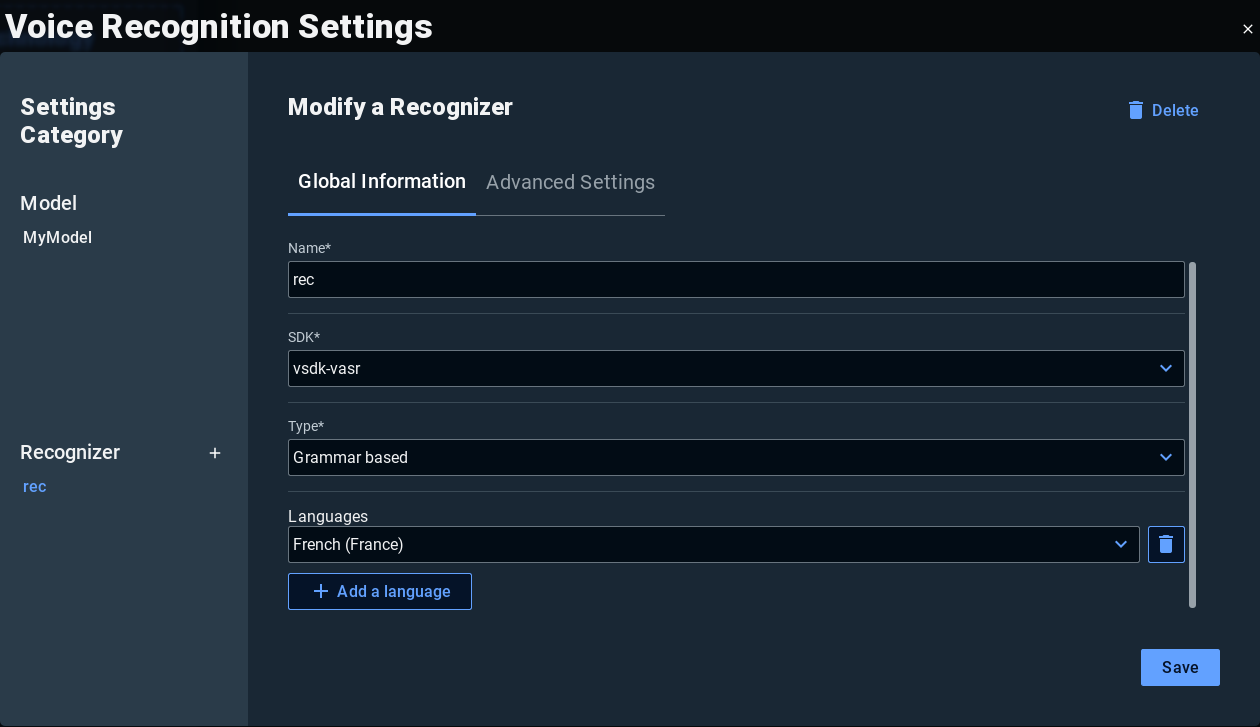 vsdk-vasr,vsdk-csdkandvsdk-tnl(depending on your model type and your license).Languages. Select the language used by the recognizer