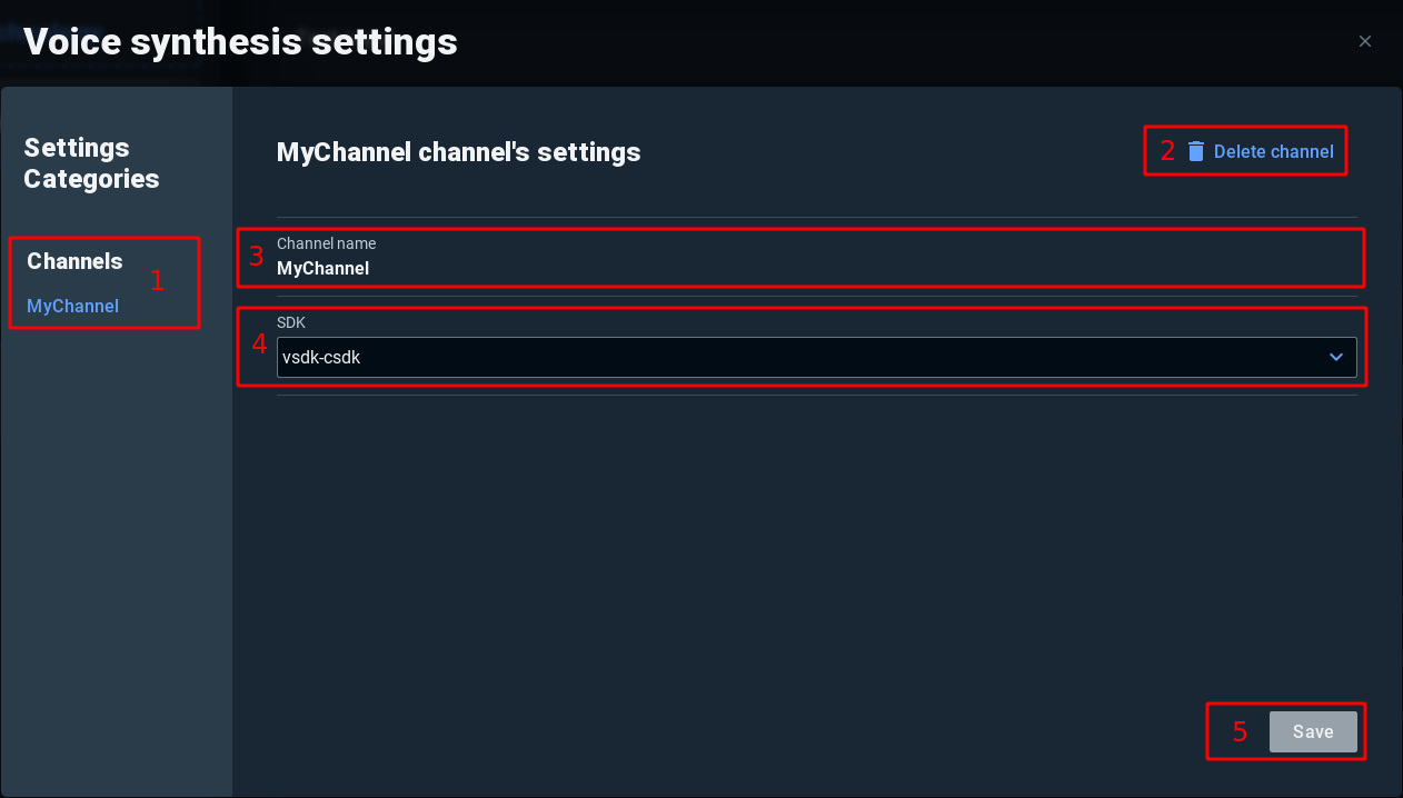 Voice synthesis settings. This button will open the voice synthesis settings which allows you to edit a channel SDK or delete a channel.