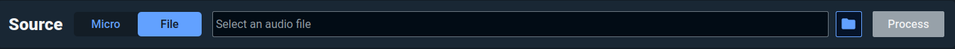 By clicking on Select an audio file or by clicking on the Open icon you will be able to import an audio file from your computer (Audio files must be Signed 16-bit Little Endian, Rate 16000 Hz PCM). Click on the Process button after selecting the correct file.