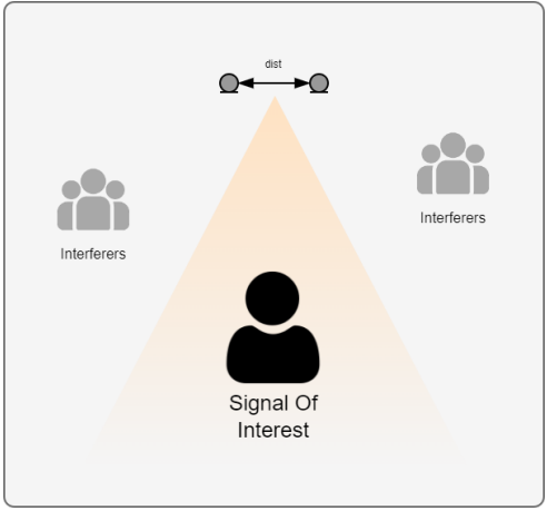 Source separation isolates signal coming from the direction perpendicular to the line of the microphone array, as shown in the figure below.