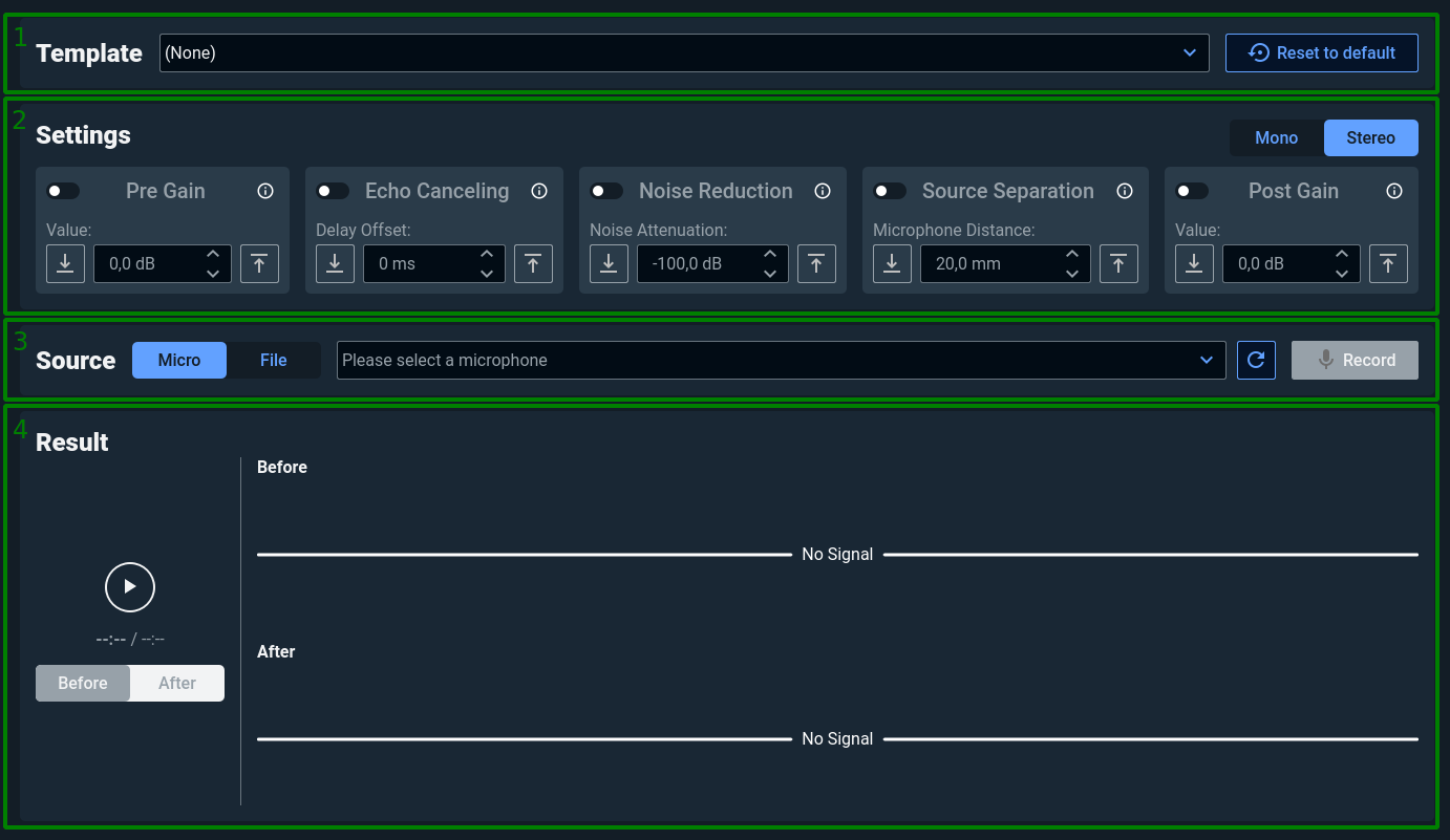 Settings. This section contains all the possible settings you can apply to your input audio signal. Each individual card has been designed to offer dedicated processing capabilities. Here is the complete list of cards: