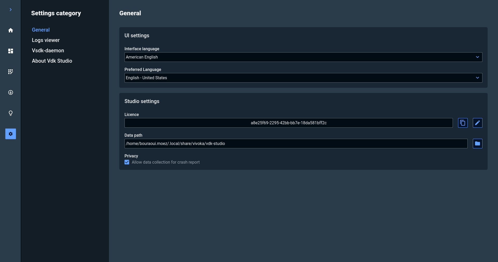6. Settings: information about your VDK instance.